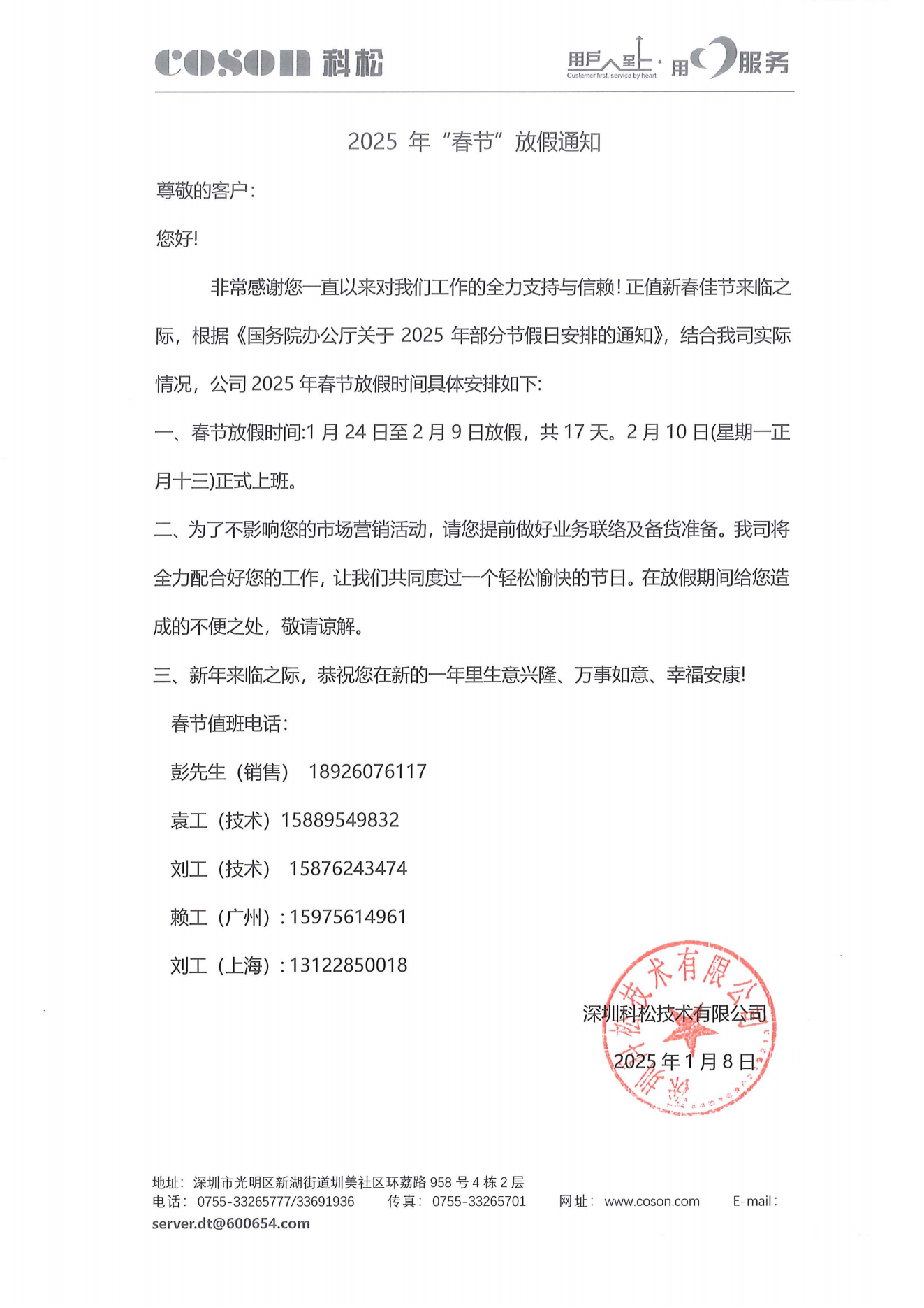 由于放假给大家带来的不便,敬请谅解!如有紧急事宜请拨打电话18926076117(彭工),15889549832(袁工),13590218692(邹工)。......